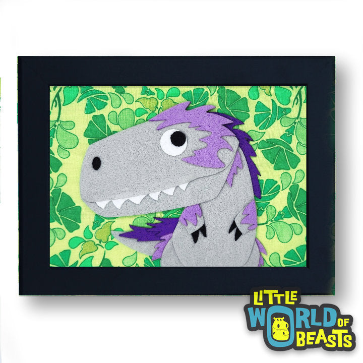 This fun frame features our T-Rex. This lovable prehistoric wall art makes a fun addition to a kids room or dinosaur collection. Already framed this whimsical wall art is easy to add to a wall or sit on a shelf.